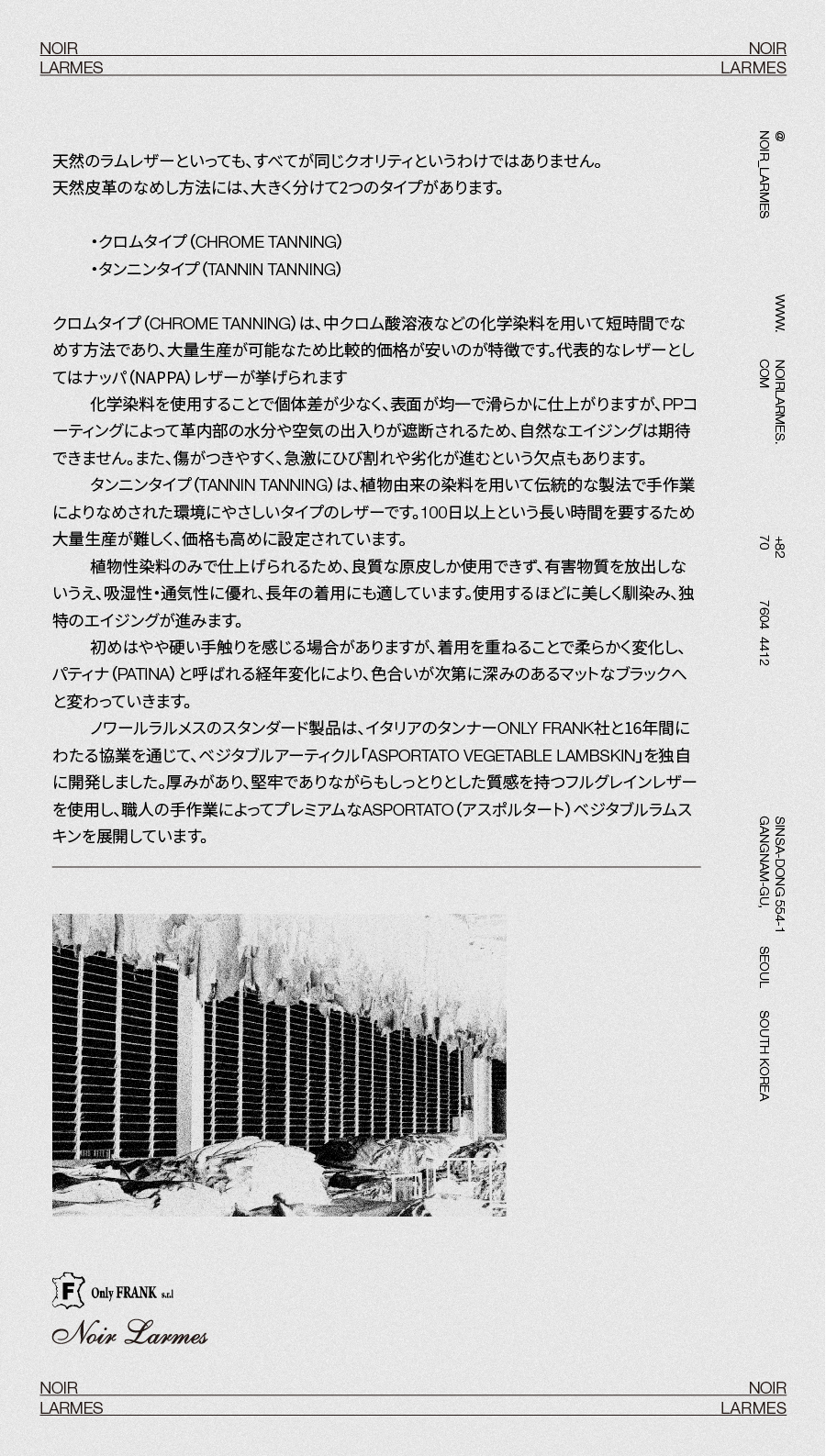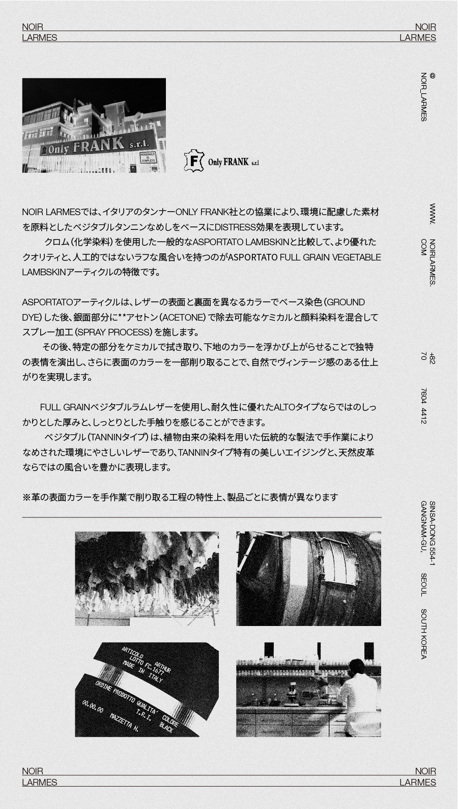 Noir Larmes(ノワール・ラルム)は、イタリアの老舗タンナー Only Frank(オンリーフランク)社との16年にわたる協業を通じて、 環境配慮型のベジタブルタンニン鞣しをベースとし、ディストレス効果を施した独自のアーティクル「Asportato Full Grain Vegetable Lambskin」を開発しました。 このAsportatoアーティクルは、一般的なクロム(化学染料)鞣しのAsportatoラムスキンに比べ、よりナチュラルで粗削りな表情と、 それに相反する高い品質と深みある表現を両立しているのが特徴です。