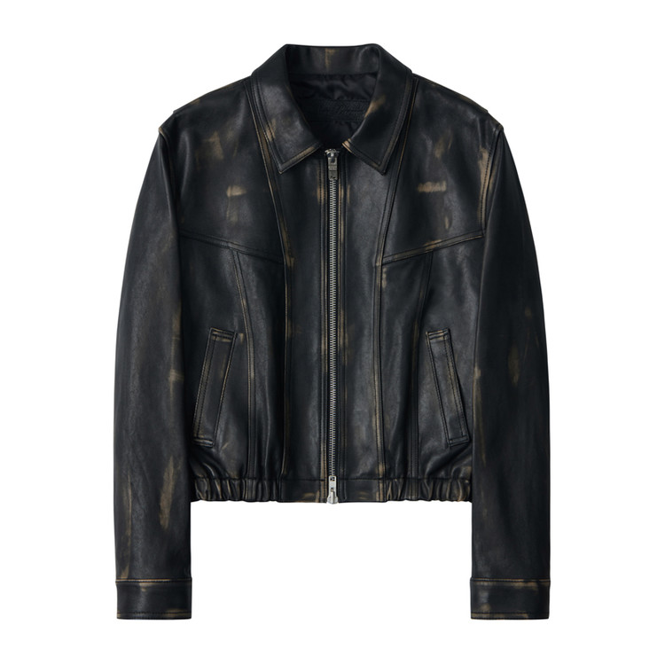 工程としては、まず革の表裏に異なる色を配したグラウンド染色を施した後、 銀面層にアセトンで拭き取り可能なケミカルとカラー染料を混ぜたものをスプレーで塗布。 その上で、意図した箇所の表層色を部分的に削り取り、下地のグラウンドカラーが浮かび上がるよう演出します。 さらにその上から丁寧に表面の色を剥がすことで、一点ごとに異なるヴィンテージ感と自然な風合いが生まれます。