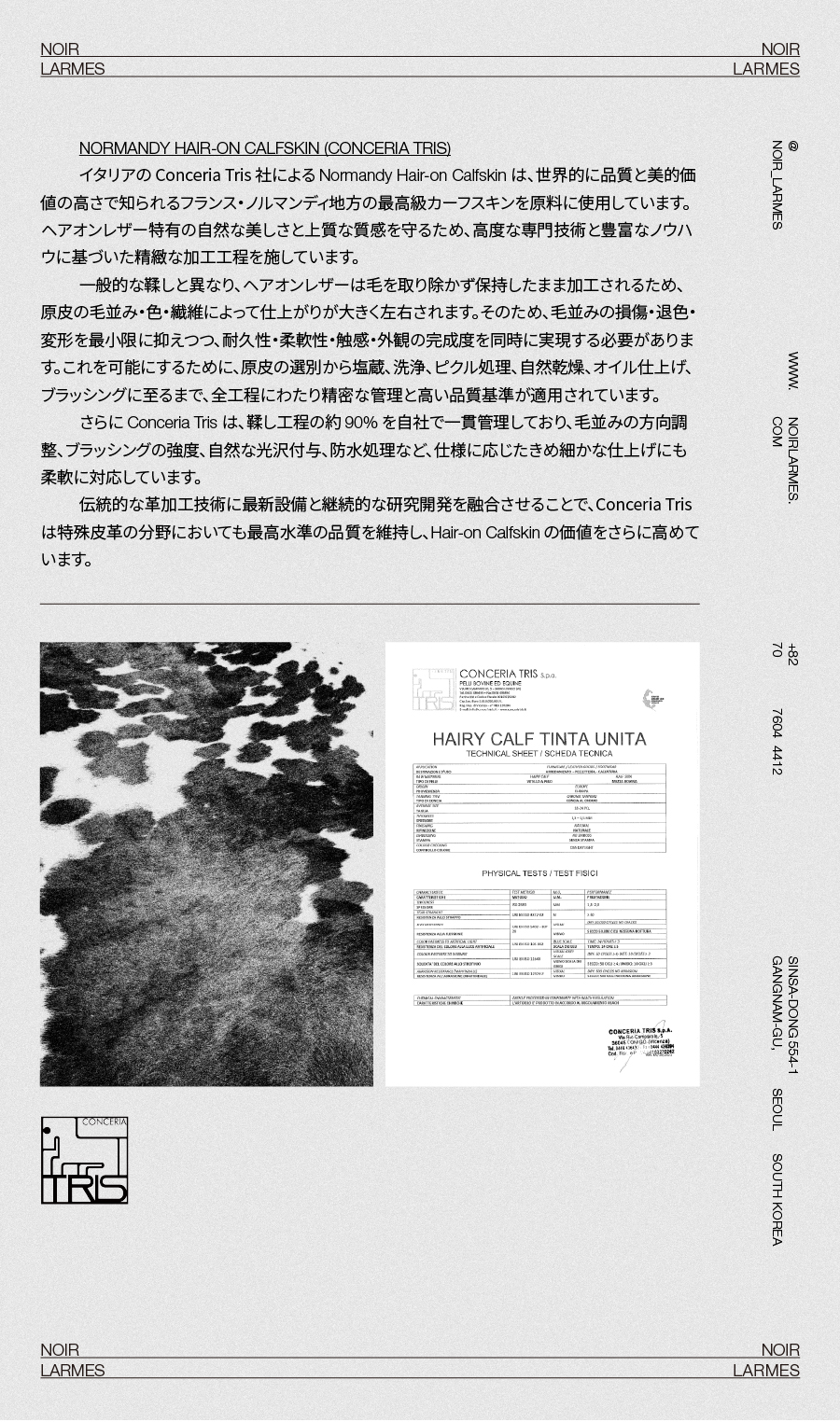 伝統的な革加工技術に最新設備と継続的な研究開発を融合させることで、Conceria Tris は特殊皮革の分野においても最高水準の品質を維持し、Hair-on Calfskin の価値をさらに高めています。