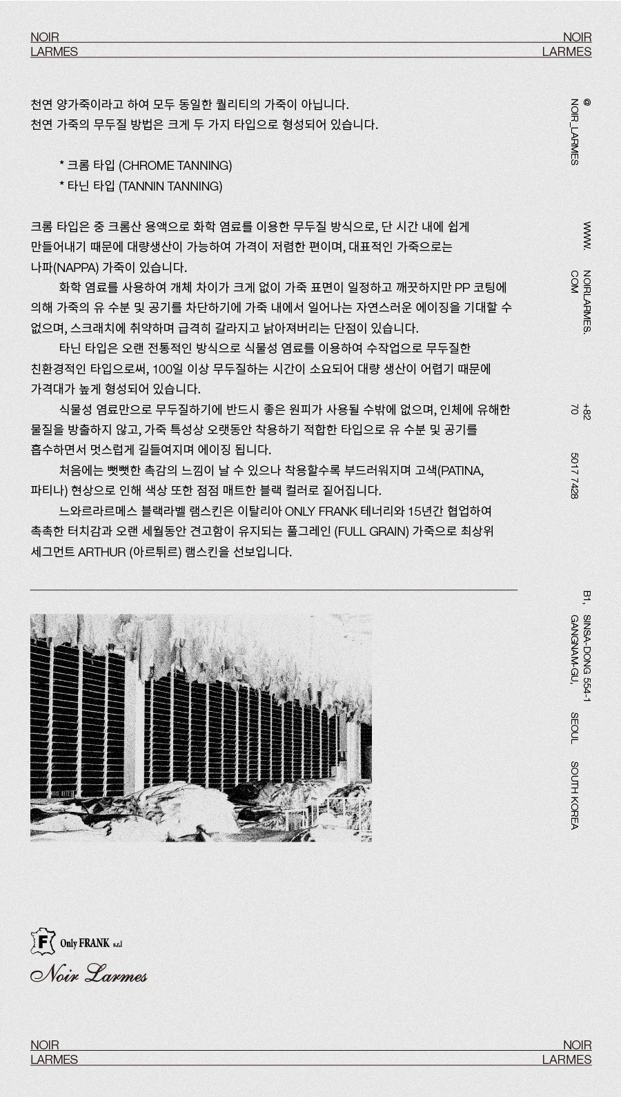 NOIR LARMES에서는 이탈리아 ONLY FRANK사 테너리와의 15년간의 협업으로 타닌 무두질을 베이스로 한 최상급 ARTHUR 아티클을 독자적으로 개발하였습니다.