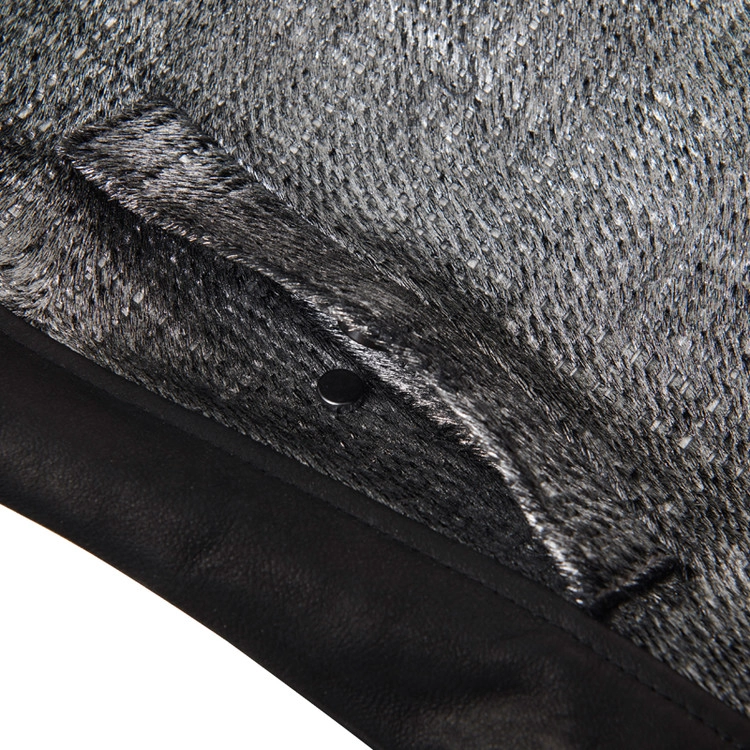 このTOWER LASERATO加工は、格子模様を立体的に表現するための工程であり、平面的ではなく奥行きのある質感を実現するために3回以上繰り返して加工されます。その後、立体感を保持するためにcompressore da aria(空気圧縮処理)を施し、高級感と奥行きを兼ね備えた最上級のヘアオンレザーアーティクルに仕上げられています。