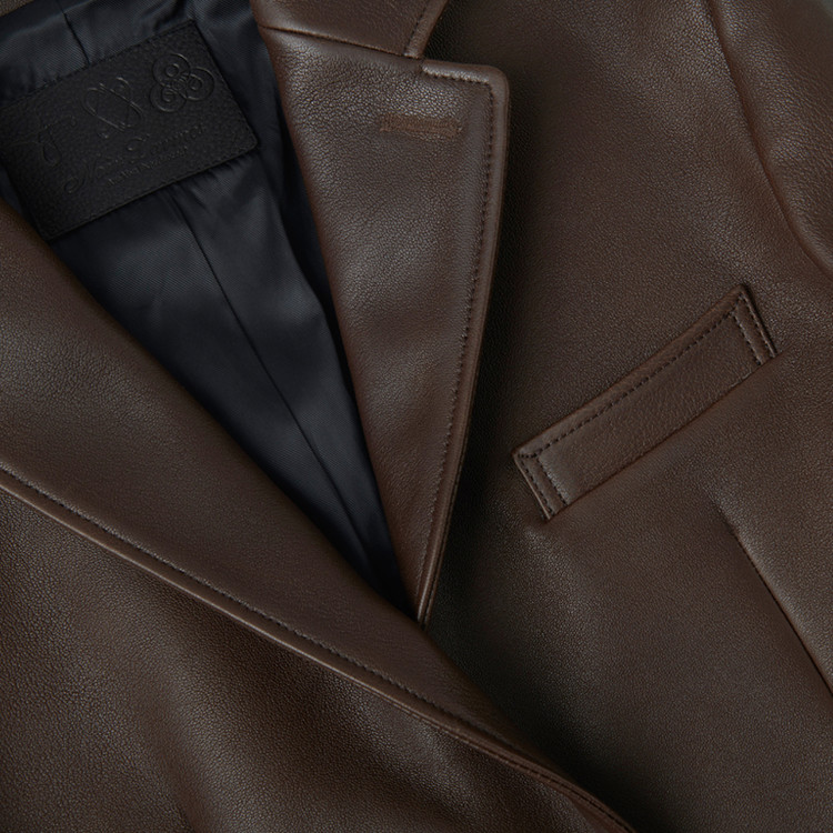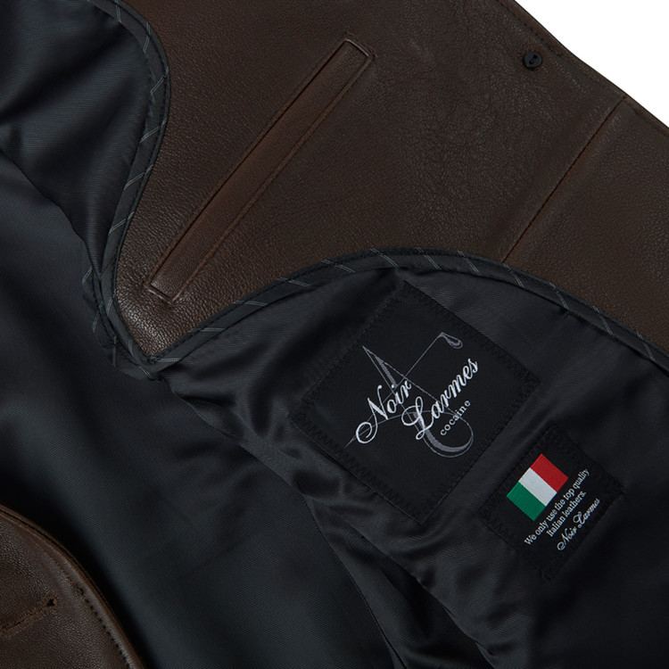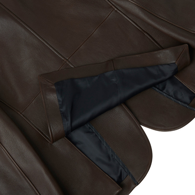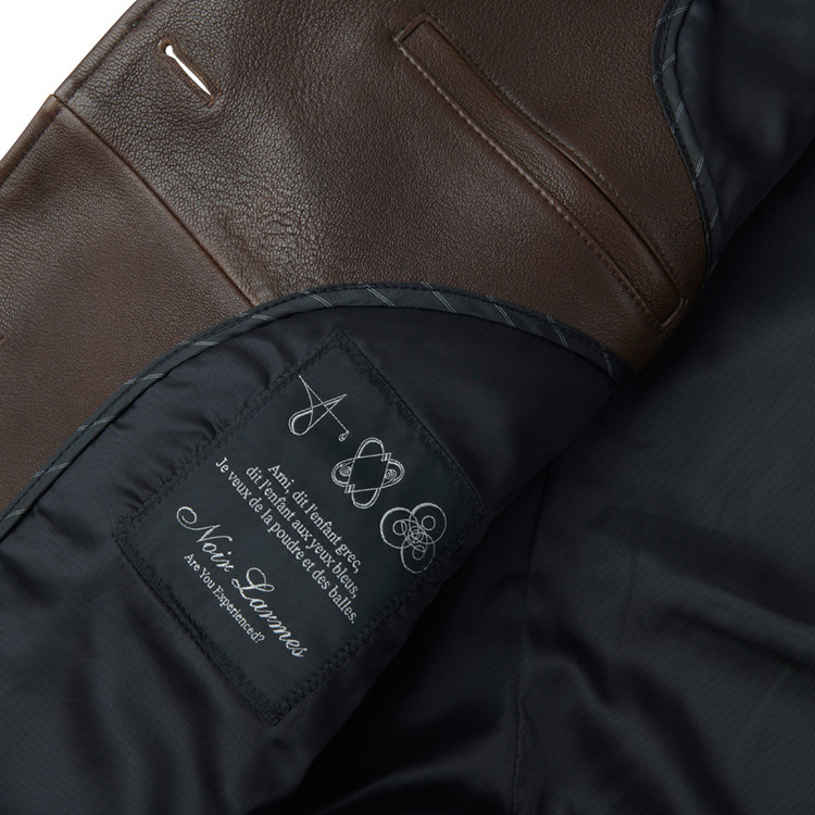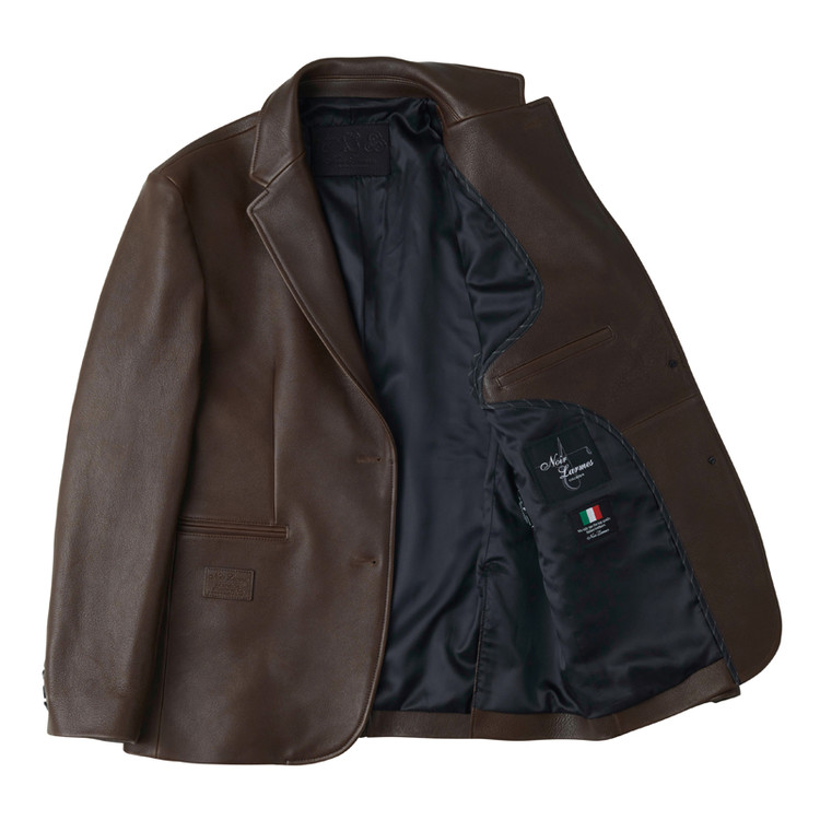 2つボタンのシングルブレザータイプのレザージャケットで、ノッチドラペル、バルカポケット、フラップポケット、ダブルベント仕様。オリジナルの水牛ボタンを使用。脇下に汗止め当て布を配し、サドルステッチで仕上げています。